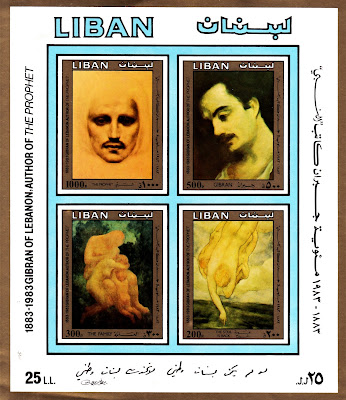 LEBANON POST in 1983 issued this stamp sheet of Khalil Gibran featuring artwork from his most famous book, "The Prophet". He is chiefly known in the English-speaking world for this 1923 book, which was an example of inspirational fiction including a series of philosophical essays written in poetic English prose.