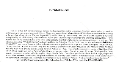 USPS on 1 September 1994 continued with the Legends of American Music series, honoring five popular American singers. The featured performers, each featured separately on 29 cent stamps, were Nat "King" Cole, Ethel Merman, Bing Crosby, Al Jolson and Ethel Waters. Postmark cancellation was in Washington D.C.