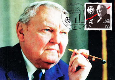 DEUTSCHE BUNDESPOST on 4th February 1997 issued a commemorative stamp to mark the 100th birth anniversary of former Federal Republic of Germany Chancellor Ludwig Erhard. This 100 Pf postage stamp showed a portrait of Ludwig Erhard and the iconic federal eagle. Shown here is a maxicard, first day cover cachet and folder with the postage stamp affixed to each item. Postmark cancellation originated from Bonn.